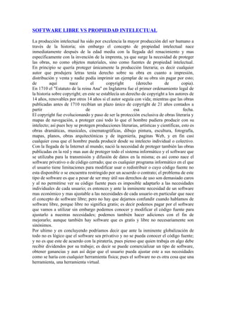 El documento contrasta el software libre frente al software privativo. Explica que el concepto de propiedad intelectual surgió para proteger las obras literarias de la época, pero con el tiempo se expandió a casi todo lo producido por el intelecto humano. Con la llegada de Internet, surgió la necesidad de proteger también el software y las obras digitales, dando lugar al software privativo de código cerrado. Sin embargo, el software libre permite conocer y modificar el código para ajustarlo a cada usuario, aunque esto no significa que sea gratis. El document