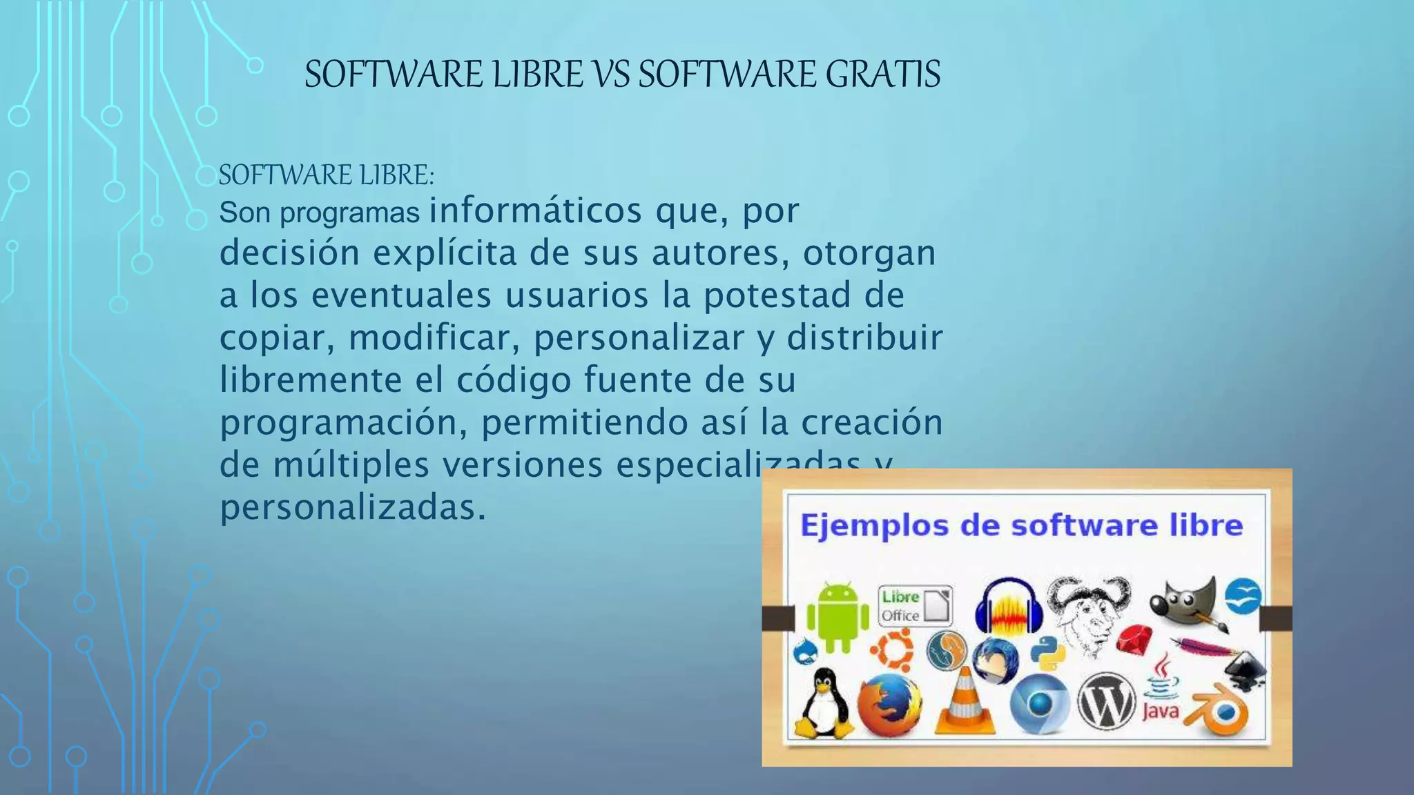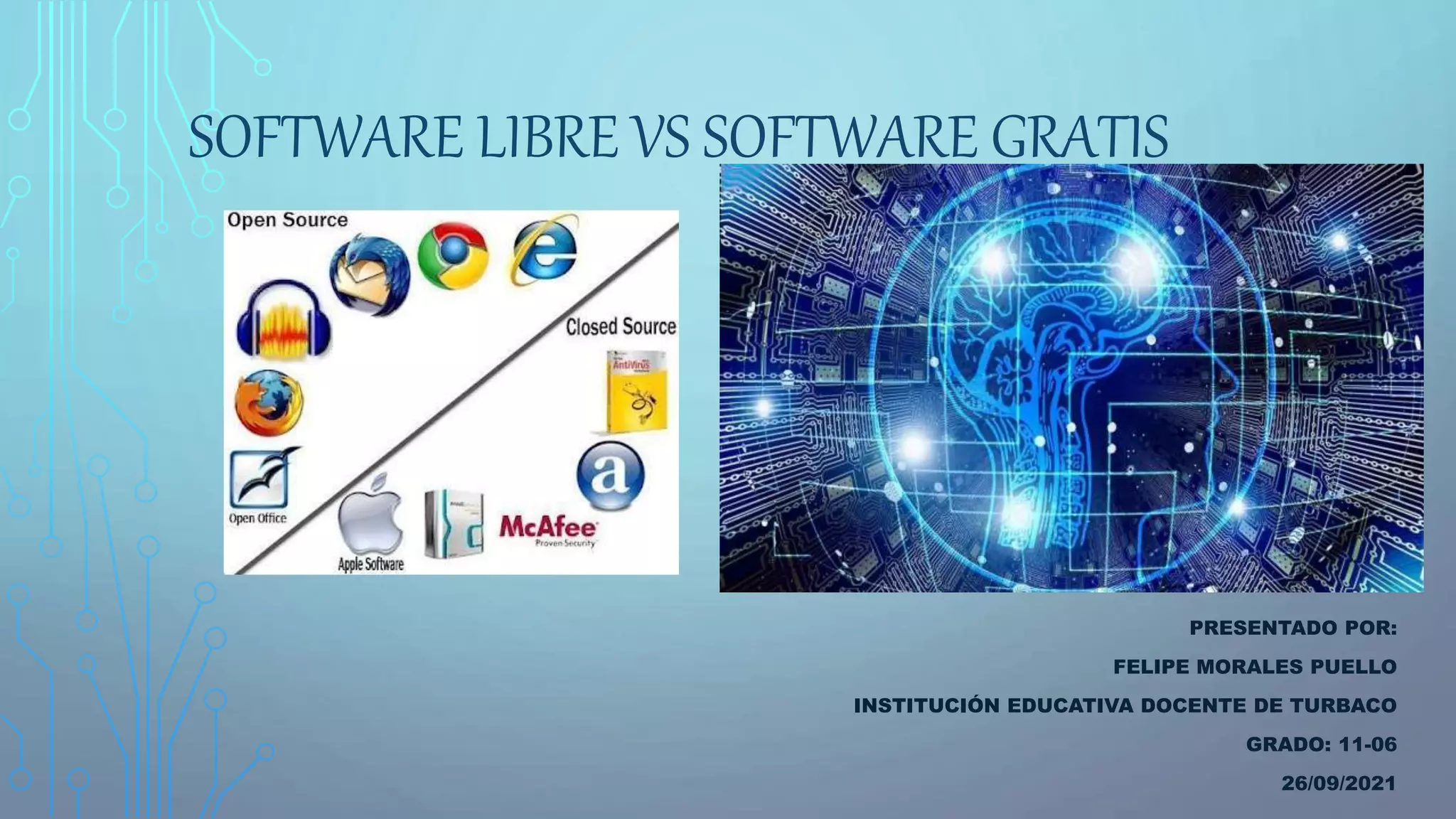 El documento compara el software libre y el software gratis. El software libre respeta las libertades de los usuarios para ejecutar, copiar, modificar y redistribuir el software libremente. Tiene cuatro libertades fundamentales y una licencia como GPL. El software gratis se puede obtener sin costo pero tiene restricciones en su copyright y no puede modificarse o venderse libremente como el software libre.