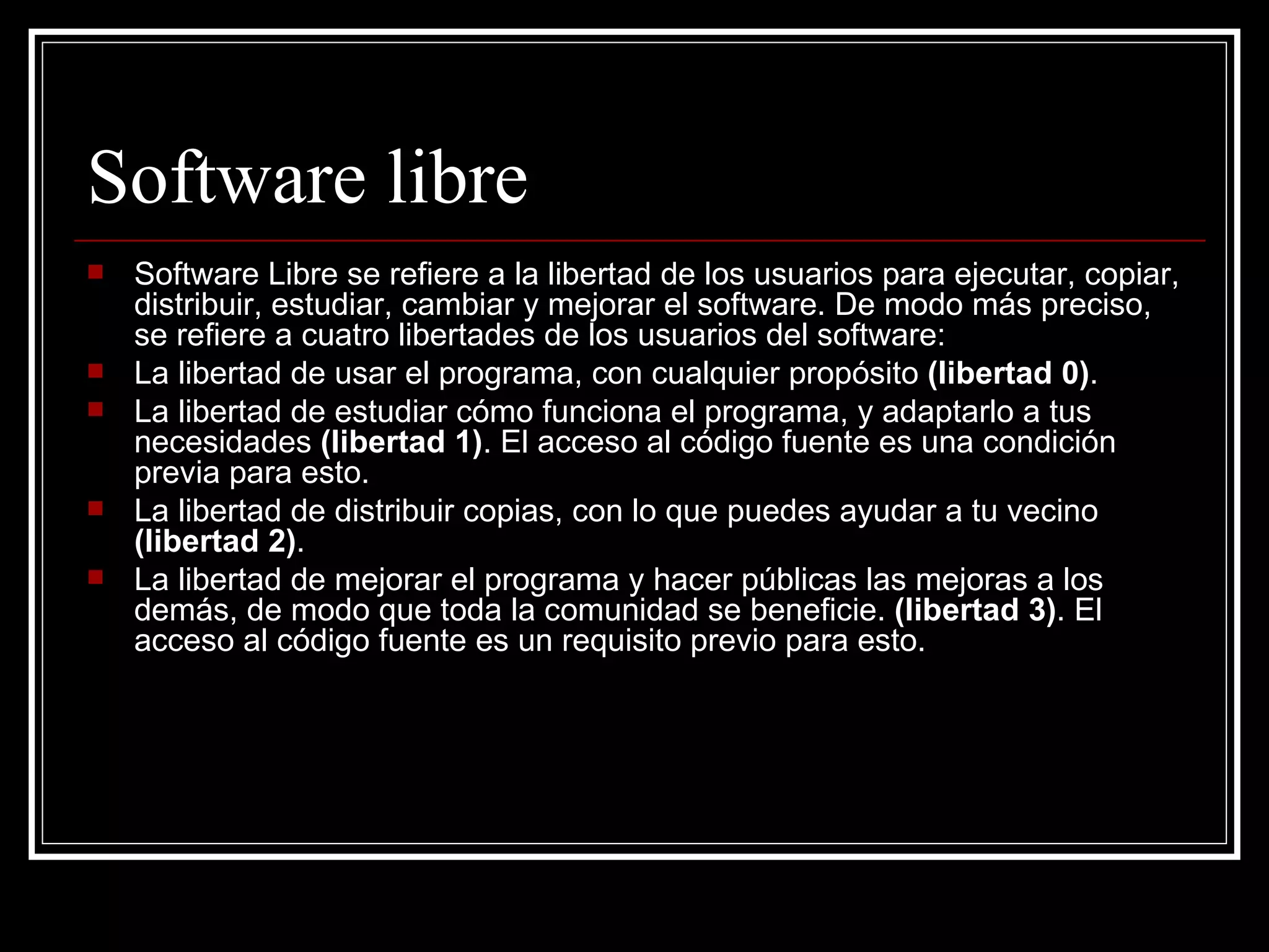 El documento contrasta el software libre y el software propietario. Define el software libre como aquel que otorga a los usuarios cuatro libertades: usarlo para cualquier propósito, estudiar y modificar su código, distribuir copias, y mejorarlo y compartir mejoras. El software propietario limita estas libertades al restringir el uso, modificación o redistribución del software o no proveer acceso a su código fuente.