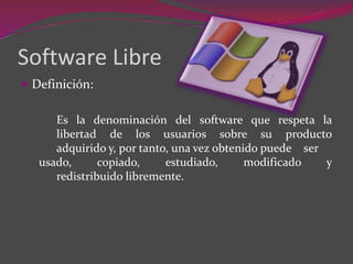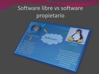 El documento compara el software libre y el software propietario. Define el software libre como aquel que permite a los usuarios usar, copiar, estudiar, modificar y redistribuir el software libremente. El software propietario limita estas libertades del usuario. Luego enumera las ventajas e inconvenientes de cada uno, como la gratuidad pero menor facilidad de uso del software libre, versus el mayor costo pero mejor compatibilidad del software propietario.