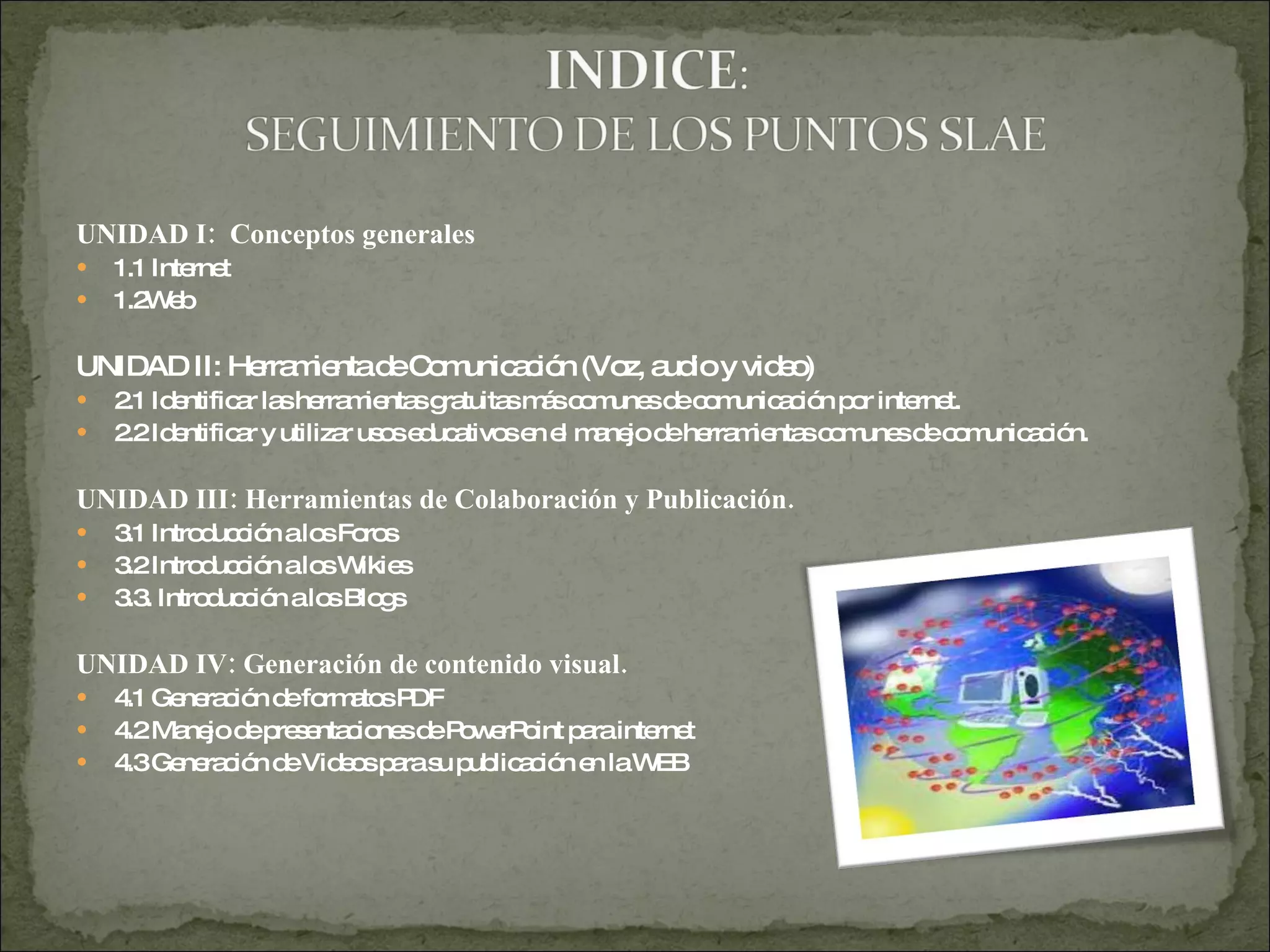 Este documento presenta una unidad de aprendizaje sobre software libre y aplicaciones educativas. Cubre conceptos generales de Internet y la Web, así como herramientas de comunicación como listas de distribución, foros y chats. También examina herramientas de colaboración como foros, blogs y wikis, y métodos para generar contenido visual como formatos PDF, presentaciones PowerPoint y videos para publicar en la Web.