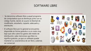 El documento describe la diferencia entre software libre y gratuito. El software libre se distribuye con su código fuente y permite modificarlo, estudiarlo, copiarlo, distribuirlo y publicar cambios. El software gratuito es de distribución gratuita pero mantiene restricciones de copyright que no permiten modificarlo o venderlo libremente. Algunos ejemplos de software libre son Linux, Open Office y Ares, mientras que software gratuito incluye versiones limitadas de Linux Ubuntu, LibreOffice y GIMP.