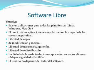 El documento describe las ventajas y desventajas del software libre y propietario. Las principales ventajas del software libre son que es gratuito, puede copiarse, modificarse y redistribuirse libremente. Sin embargo, a veces es más difícil de instalar y tiene interfaces menos amigables. El software propietario suele estar mejor diseñado pero es más caro y el usuario depende completamente del propietario.