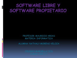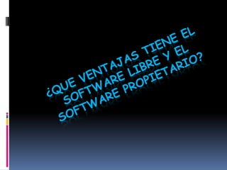 Este documento compara el software libre y el software propietario, destacando las ventajas y desventajas de cada uno. El software libre ofrece aplicaciones gratuitas para múltiples plataformas, libertad de modificación y distribución, pero a veces puede ser más difícil de instalar. El software propietario es más fácil de obtener y tiene interfaces más pulidas, pero es de pago, no se puede modificar y depende completamente del propietario. El documento también menciona ejemplos populares de cada tipo de software.
