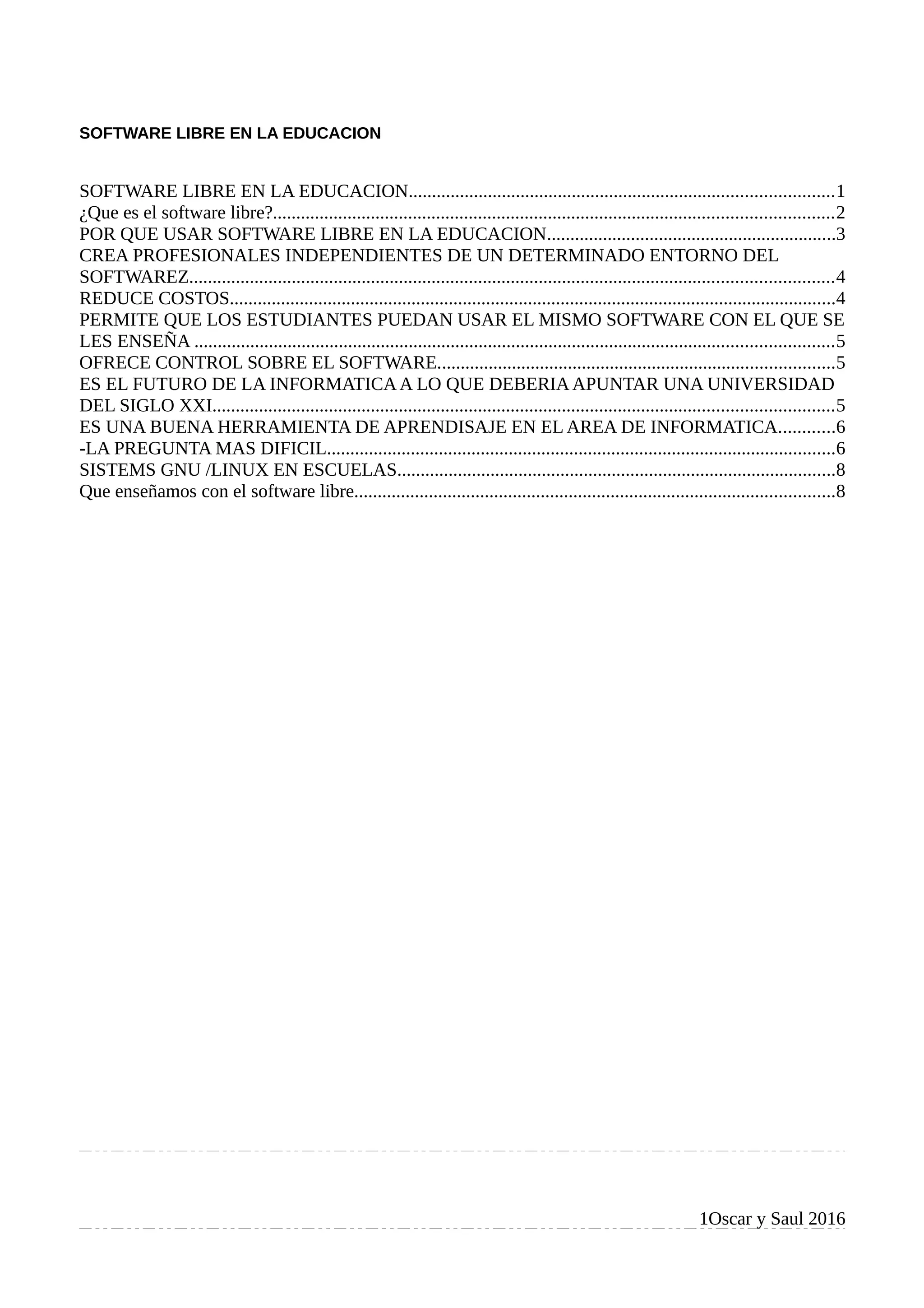 El documento habla sobre las ventajas del uso de software libre en la educación. Explica que el software libre permite a los usuarios usar, copiar, estudiar, modificar y redistribuir el software libremente. Luego detalla algunas de las ventajas de usar software libre en la educación como reducir costos, permitir que los estudiantes usen el mismo software que en la escuela, y ofrecer más control sobre el software. Finalmente concluye que el software libre es el futuro de la informática y debería ser el enfoque de las universidades del siglo XXI