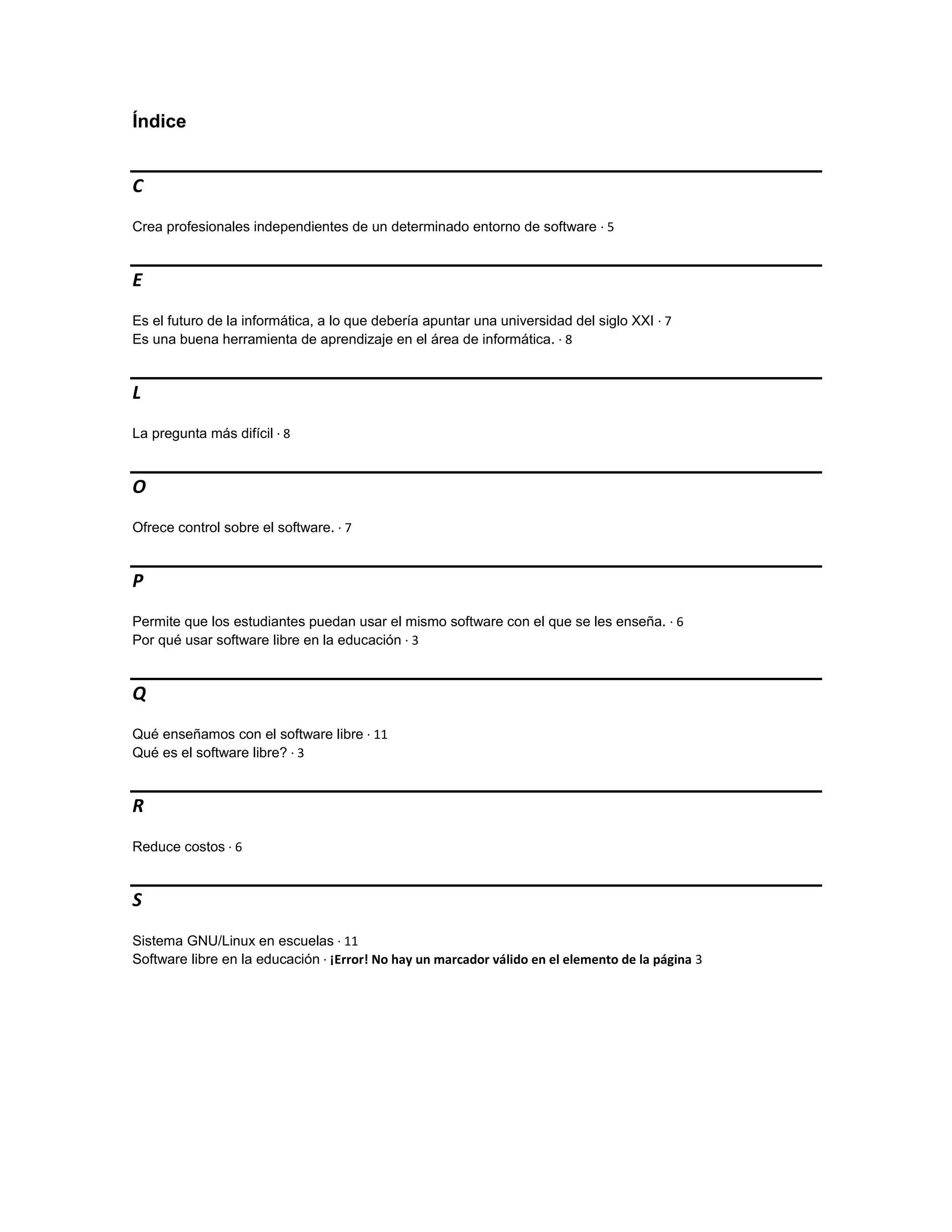El documento describe los beneficios del uso de software libre en la educación. En resumen: 1) El software libre crea profesionales independientes al enseñar estándares abiertos en lugar de productos cerrados; 2) Reduce los costos al evitar licencias y permitir el reciclaje de equipos; 3) Permite a los estudiantes usar el mismo software que en la escuela.