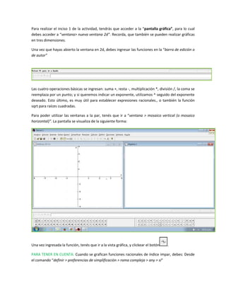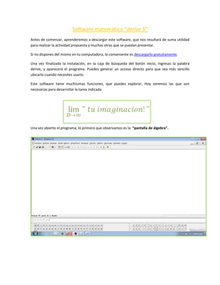 Este documento proporciona instrucciones para usar el software matemático Derive 5. Explica cómo descargar e instalar el programa y cómo acceder a sus diferentes funciones y herramientas, incluidas las pantallas de álgebra y gráfica. También describe cómo graficar funciones, calcular dominios, conjuntos de positividad y negatividad, cortes con los ejes, asíntotas, paridad, máximos y mínimos, crecimiento y decrecimiento, y puntos de inflexión utilizando las herramientas del programa.