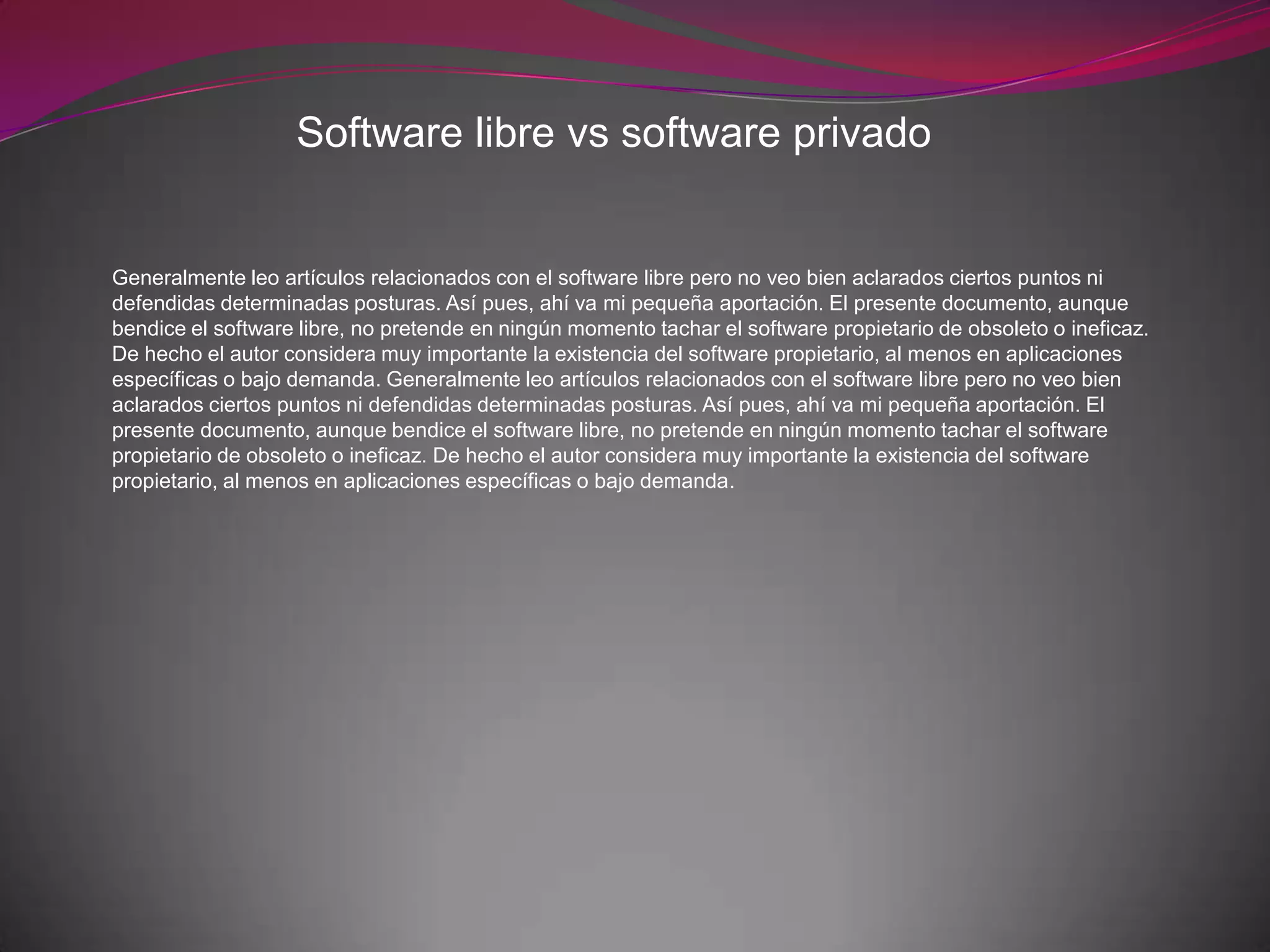 El documento ofrece una reflexión sobre el software libre y propietario, resaltando las ventajas del primero, como su bajo costo, libertad de uso y fomento de la competencia, sin desestimar la importancia del software propietario en ciertas aplicaciones. Se menciona cómo el software libre permite a las pequeñas y medianas empresas crecer sin las limitaciones de licencias caras, mientras que el propietario asegura inversiones y soporte en hardware específico. También se discuten las desventajas del software propietario, como la falta de soporte continuo y la obsolescencia programada, en contraste con la sostenibilidad del software libre.