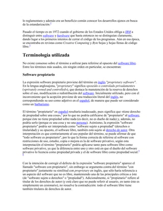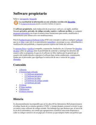 Este documento define y discute varios términos relacionados con el software propietario y no libre, incluyendo software privativo, de código cerrado y privado. Explica que el software propietario limita las libertades de los usuarios a usar, modificar y redistribuir el software. También resume brevemente la historia del software propietario y las críticas éticas a este tipo de software.
