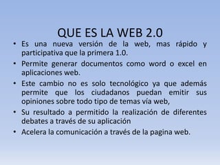 El documento describe la Web 2.0, incluyendo que permite la participación de los ciudadanos a través de debates en línea y opiniones sobre temas políticos. También explica cómo los medios de comunicación se han visto afectados por el surgimiento gratuito de información en Wikipedia y YouTube, y cómo la Web 2.0 ha acelerado la comunicación a través de blogs y wikis que complementan la enseñanza de manera colaborativa.
