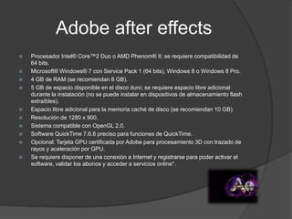 Los documentos enumeran los requisitos mínimos de hardware y software para instalar y ejecutar varios programas de Adobe como Illustrator, After Effects, Premiere Pro y Photoshop. En general, se requiere un procesador de 64 bits, varios gigabytes de RAM, espacio en disco duro, una tarjeta gráfica compatible con OpenGL y una resolución mínima de 1024x768. También se requiere una conexión a Internet para activar el software y acceder a servicios en línea.