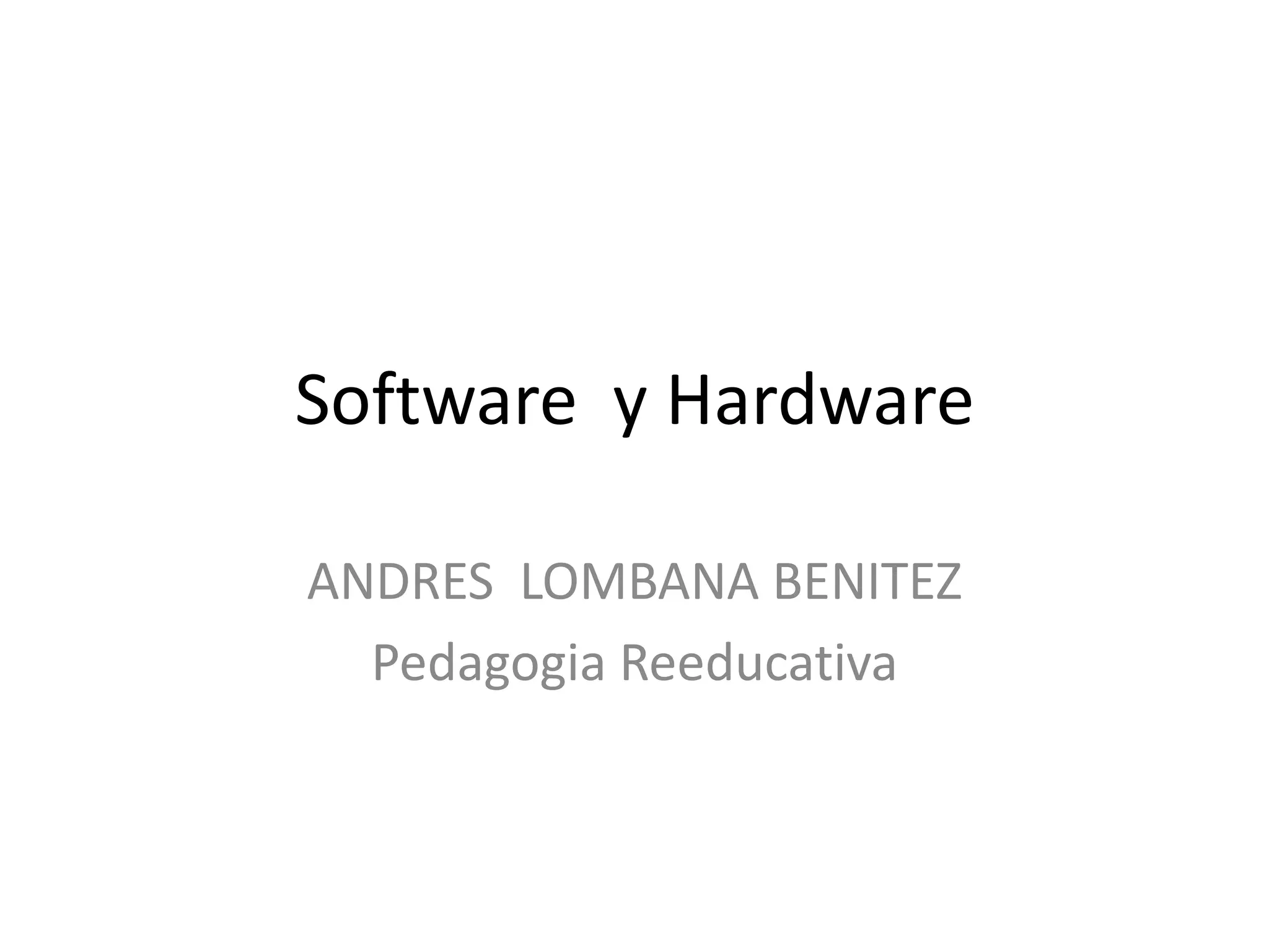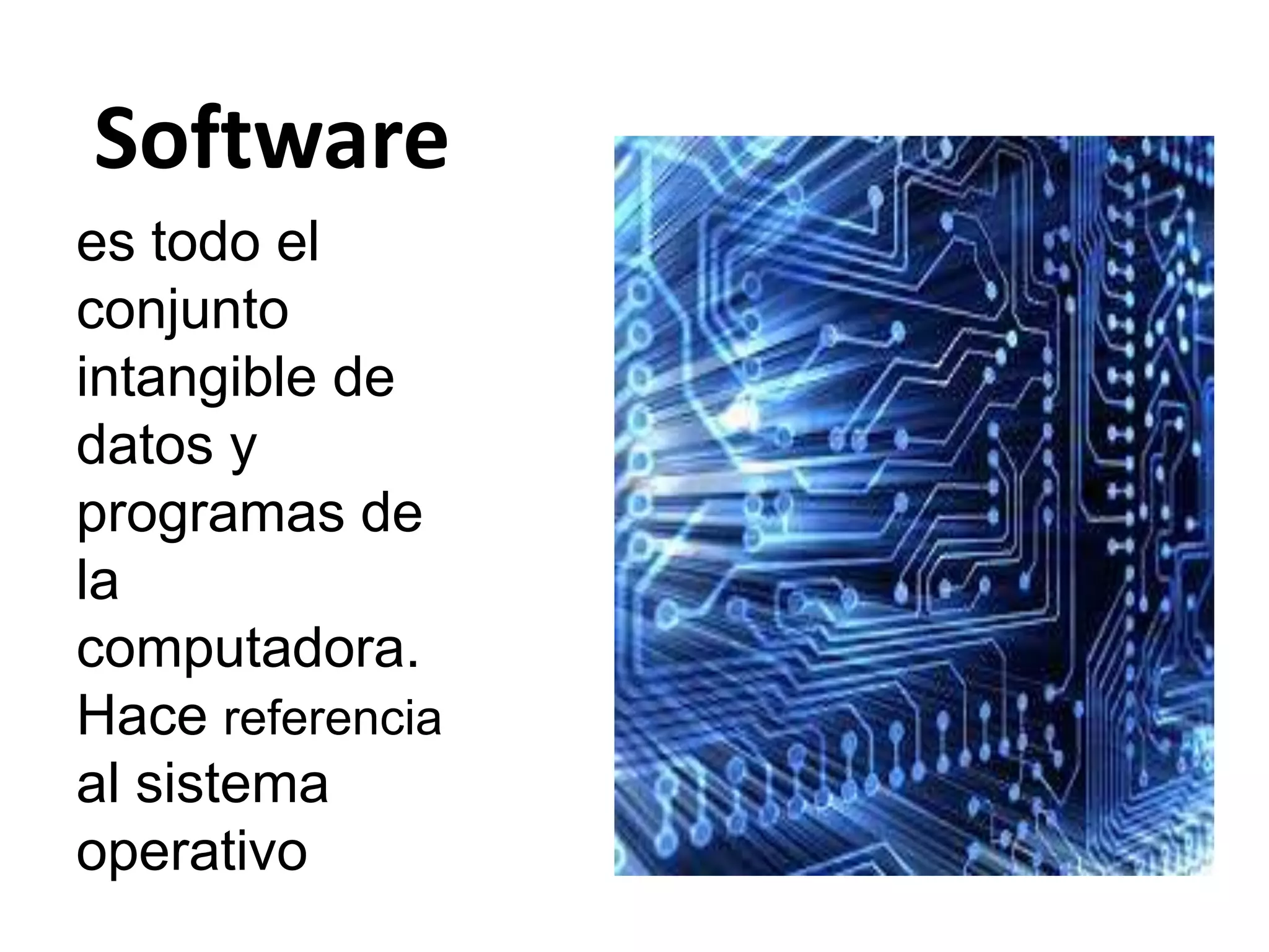 El documento describe la diferencia entre software y hardware. El software se refiere a los programas y datos intangibles de una computadora, incluyendo el sistema operativo. El hardware son los componentes físicos como la placa base, CPU y monitor. El hardware se divide en hardware básico, que incluye piezas fundamentales como la placa base y monitor, y hardware complementario, que son dispositivos adicionales como impresoras y escáneres.