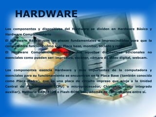 El documento describe los componentes del hardware y software de una computadora. Explica que el hardware se divide en básico y complementario, siendo la placa base el componente más importante. Además, clasifica los componentes de hardware en grupos como entrada, procesamiento, almacenamiento y salida. Finalmente, define el software como programas e instrucciones y lo divide en sistemas, aplicaciones y programación.