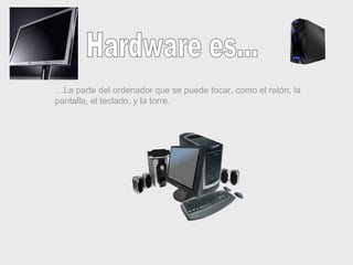 Este documento describe los componentes básicos de hardware y software de un ordenador. El hardware incluye la unidad central de proceso, memoria principal, buses y periféricos como teclado, monitor e impresora. El software incluye el sistema operativo que permite la comunicación entre hardware y aplicaciones, drivers que controlan periféricos, y software de aplicaciones como procesadores de texto.