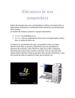 Este documento describe la estructura básica de una computadora. Explica que se compone de dos grupos principales: el software, que incluye el sistema operativo, y el hardware, que son los componentes físicos como la tarjeta madre, el disco duro y la tarjeta de video. También describe que el software se divide en aplicaciones, utilidades y el sistema operativo, mientras que el hardware incluye dispositivos de almacenamiento, entrada, salida y procesamiento.