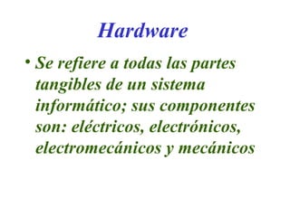 El hardware se refiere a las partes físicas y tangibles de un sistema informático como cables, gabinetes, periféricos y otros elementos, mientras que el software se refiere a los componentes lógicos como aplicaciones, sistemas operativos y programas que hacen posible que un sistema funcione. El hardware ha pasado por cuatro generaciones tecnológicas mientras que el software incluye aplicaciones, sistemas operativos y otros componentes lógicos necesarios.
