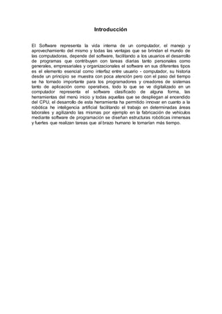 1) El documento describe el software, su historia, tipos y procesos de creación. 2) Explica que el software representa la vida interna de un computador y que su desarrollo ha permitido innovaciones como la robótica e inteligencia artificial. 3) Detalla los tipos principales de software - sistema, programación y aplicación - y las etapas típicas para crear software como captura de requisitos, diseño, codificación y pruebas.