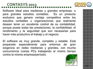 Contasys 2013 es un software diseñado para medianas y grandes empresas, que optimiza el control contable a través de características avanzadas y confiables, ideal para entornos de trabajo con múltiples usuarios. Ofrece funcionalidades como la gestión de múltiples empresas y monedas, generación automática de asientos contables y un interfaz renovado y amigable. Además, cuenta con soporte online y está construido con tecnología .NET y SQL Server para garantizar seguridad y eficiencia.