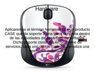 El software son las instrucciones que las computadoras usan para manipular datos. El hardware incluye herramientas como CASE que brindan soporte para tareas de desarrollo de software. La motherboard es la placa principal que conecta los componentes de la computadora como la CPU, memoria RAM, buses de expansión y otros dispositivos. El microprocesador, también conocido como CPU, es el cerebro de la computadora que procesa información numérica y ejecuta instrucciones almacenadas en la memoria.