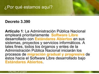 El documento habla sobre el software libre. Define el software libre como un programa que garantiza al usuario acceso al código fuente, la ejecución con cualquier propósito, la redistribución y modificación del programa bajo las mismas condiciones de licenciamiento. También describe algunos de los éxitos notables del software libre como Linux, Apache y Firefox. Explica el proceso colaborativo detrás del desarrollo de software libre y los retos y beneficios de su adopción.