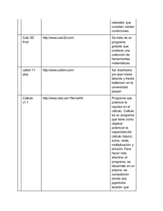 Este documento lista varios softwares educativos de matemáticas, incluyendo su nombre, enlace de descarga y breve descripción. Los softwares cubren una variedad de temas matemáticos como sumas, fracciones, geometría, cálculo y estadística. Algunos softwares también se enfocan en otras áreas como lenguaje y astronomía. La mayoría de los softwares son gratuitos y de código abierto.