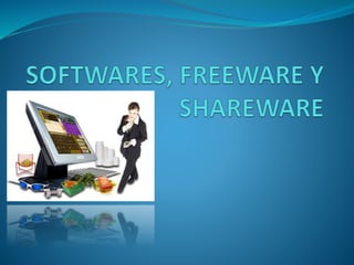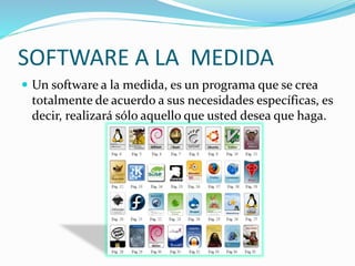 Este documento describe tres tipos de software: software a la medida, que se crea específicamente para satisfacer las necesidades del usuario; freeware, que es software gratuito que puede redistribuirse con algunas restricciones; y shareware, que permite una evaluación gratuita del software con limitaciones hasta que se realiza un pequeño pago para obtener una licencia completa.