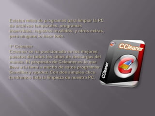 Este documento describe 4 programas diferentes para limpiar y optimizar un sistema operativo. El primer programa es un limpiador de registro portátil y efectivo. El segundo programa desinstala automáticamente programas y accesorios preinstalados. El tercer programa elimina controladores de hardware no utilizados para evitar problemas. El cuarto programa es el limpiador de programas de Microsoft.