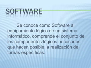 El documento presenta un resumen sobre software. Define software como el equipamiento lógico de un sistema informático que incluye programas como el sistema operativo y aplicaciones. Clasifica el software en de sistema, como sistemas operativos y controladores de dispositivos, y de aplicación para tareas específicas como procesadores de texto y hojas de cálculo. Describe el desarrollo de software siguiendo etapas como diseño, codificación y pruebas, y menciona modelos de proceso como la cascada y los evolutivos iterativos e incrementales.