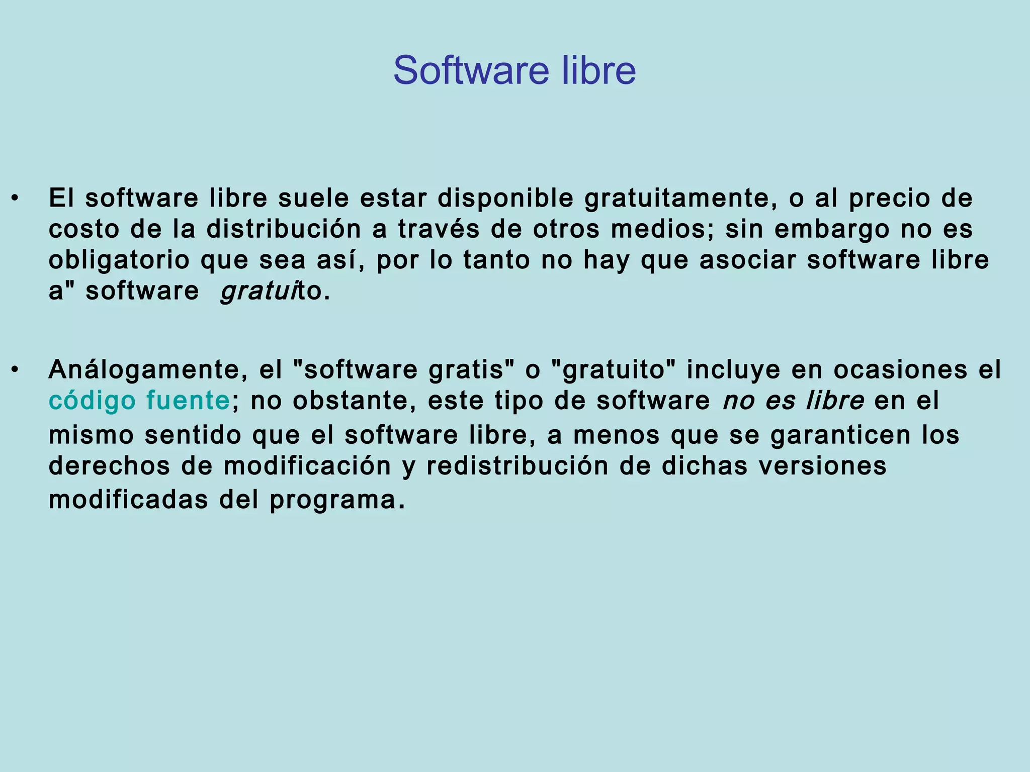 El documento contrasta el software libre y el software propietario. El software libre generalmente está disponible de forma gratuita y permite la modificación y redistribución de versiones modificadas. Sin embargo, el software libre no siempre es gratuito. El software propietario limita el uso, modificación y redistribución del software.
