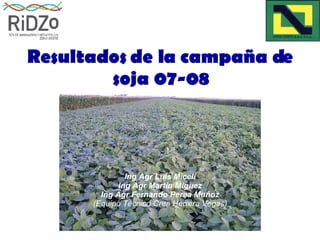 Este documento presenta los resultados de la campaña de soja de 2007-2008 en la región de Trenque Lauquen, Argentina. Reporta los rendimientos promedio de soja por zona, que variaron entre 90 y 130 quintales por hectárea. Los mayores rendimientos se obtuvieron cuando la siembra ocurrió entre el 20 de octubre y el 10 de noviembre. Las densidades óptimas de siembra fueron entre 30-35 plantas por metro cuadrado. El documento también analiza el impacto de diferentes genotipos, antecedentes, fertilizantes