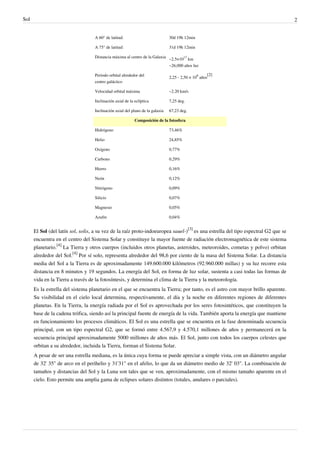El Sol es una estrella de tipo G2 ubicada en el centro del Sistema Solar. Tiene una temperatura de superficie de unos 5.778 K y está compuesto principalmente por hidrógeno (73,46%) y helio (24,85%). En su núcleo se producen reacciones de fusión nuclear que generan la energía que irradia. El Sol tiene una estructura en capas que incluye el núcleo, zona radiante, zona convectiva, fotosfera, cromosfera, corona y viento solar. En unos 5.500 mill