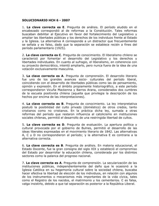 El documento presenta las respuestas correctas a 7 preguntas de un solucionario sobre la República Liberal en Chile durante el siglo XIX. La República Liberal se caracterizó por reformar la Constitución para debilitar al Ejecutivo y fortalecer el Legislativo, ampliar las libertades públicas y los derechos individuales. También se permitió un mayor desarrollo literario y cultural, y la ley interpretativa permitió otros credos religiosos además del catolicismo. El Estado asumió un rol en el desarrollo de la educación ch