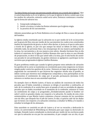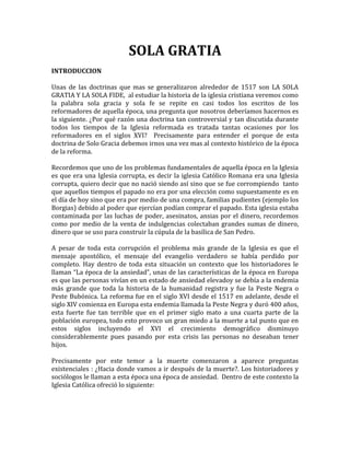 Este documento describe cómo la doctrina de la "sola gratia" se generalizó durante la Reforma como una respuesta a la enseñanza de la salvación a través de la Iglesia Católica y sus sacramentos en lugar de solo a través de la gracia de Dios. La Iglesia Católica enseñaba que la salvación se obtenía mediante la compra de indulgencias, asistiendo a misa y practicando sacramentos. Martín Lutero descubrió a través de la Biblia que la salvación es solo por la gracia de