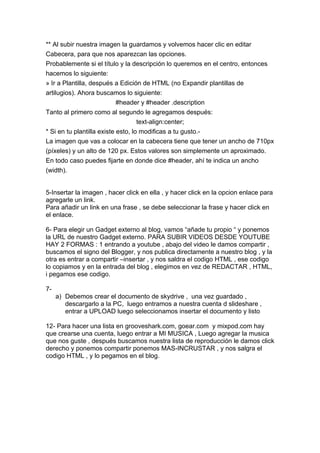 Este documento proporciona instrucciones sobre cómo crear y personalizar un blog. Explica cómo agregar imágenes, videos y enlaces hipertextuales a las publicaciones, así como cómo insertar gadgets externos. También describe cómo crear listas de reproducción de música en diferentes sitios y compartir el código HTML para publicarlas en el blog.