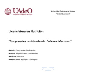 El documento describe las características nutricionales y composición de la papa (Solanum tuberosum). La papa es rica en carbohidratos, vitaminas como la C, y minerales. Contiene proteínas, lípidos y agua en menor cantidad. Además, el documento discute el origen, usos, enfermedades y potencial de la papa como alimento.