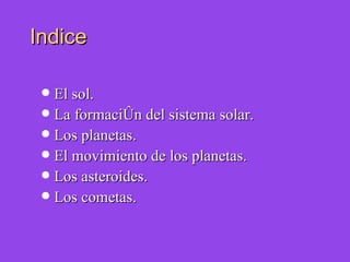 Este documento proporciona información sobre el Sistema Solar. Explica que el Sol es una bola de gas en el centro del sistema, y que los planetas se formaron a partir de una nube de gas y polvo que colapsó. Describe las características de los planetas interiores y exteriores, así como su movimiento al girar sobre sí mismos y orbitar alrededor del Sol. También habla sobre asteroides y cometas, cuerpos menores que orbitan en el sistema.