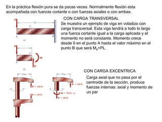 Este documento describe los conceptos básicos de la flexión pura. Explica que la flexión pura ocurre cuando un cuerpo está sujeto a dos momentos iguales y opuestos. También describe que en la flexión pura solo hay momento como fuerza interna y es constante a lo largo del elemento. Además, explica que el esfuerzo máximo en flexión pura ocurre en las fibras más alejadas del eje neutro y que su valor depende del momento y las propiedades de la sección transversal.