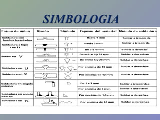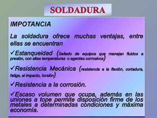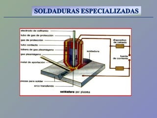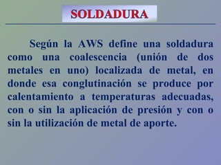 El documento proporciona información sobre diferentes tipos de soldadura, incluyendo definiciones, equipos utilizados y aplicaciones. Explica que la soldadura es la unión de dos metales mediante calentamiento y posiblemente la adición de un metal de aporte. Describe procesos como la soldadura por arco eléctrico, soldadura oxiacetilénica, y soldadura por forja. También cubre equipos como pinzas, electrodos y transformadores usados en soldadura por arco.