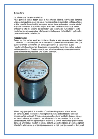 Este documento ofrece instrucciones básicas sobre cómo realizar una soldadura correcta. Explica que las piezas a soldar deben estar limpias y que el soldador debe mantenerse limpio frotándolo con una esponja húmeda. Detalla los pasos a seguir: 1) mantener las piezas unidas, 2) calentar ambas partes con el soldador, 3) aplicar estaño para que sea fundido por las piezas y no por el soldador, y 4) retirar el estaño y el soldador sin soplar sobre la unión. Advierte que soplar la