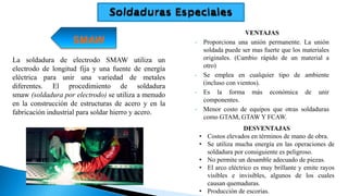 El documento proporciona información sobre diferentes tipos de soldadura, incluyendo SMAW, GMAW, GTAW, FCAW, SAW y AHW. Describe los equipos, ventajas, desventajas y aplicaciones típicas de cada uno de estos procesos de soldadura.