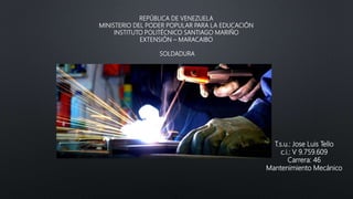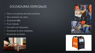 Este documento describe diferentes tipos de soldadura, incluyendo SMAW (soldadura con electrodos recubiertos), GMAW (soldadura con hilo y gas), FCAW (soldadura con electrodo fundente), GTAW (soldadura TIG), SAW (soldadura sumergida), y soldadura por resistencia. También discute equipos de soldadura como equipos inversores y las aplicaciones de la soldadura en industrias como aviación, minería e industria.