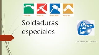 Este documento proporciona definiciones y descripciones de varios tipos de soldaduras, incluyendo soldadura fuerte, soldadura débil, soldadura por forja, soldadura a gas, soldadura por resistencia, soldadura por arco eléctrico, soldadura por arco con gas protector, soldadura TIG y soldadura MIG. Explica los procesos, materiales y equipos involucrados en cada método de soldadura.