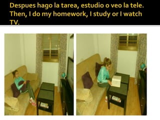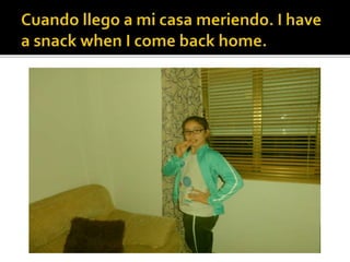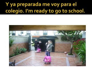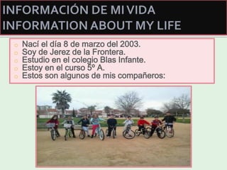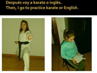 Soledad Guerrero López presenta información sobre sí misma, incluyendo su nombre, fecha de nacimiento, escuela y horario escolar. Ella describe su rutina diaria al levantarse, ir a la escuela, tomar clases como religión, lengua, matemáticas e inglés, almorzar, estudiar, ver televisión, entrenar karate, escuchar música y bailar. Ella realizó este trabajo para compartir detalles sobre su vida.