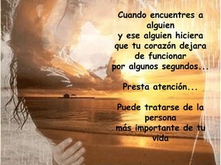 El documento ofrece consejos sobre cómo reconocer el verdadero amor a través de señales como que la otra persona hace que el corazón deje de latir, miradas intensas, besos apasionados, pensar en la otra persona todo el día y desear estar juntos, consolarse mutuamente, sentir la presencia del otro a distancia, y desear envejecer juntos. También advierte sobre no dejar pasar el amor verdadero por estar ciego a estas señales.