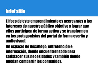 Este documento presenta un resumen del sitio web propuesto, el cual busca acercarse a los intereses del público objetivo a través de contenido escrito y audiovisual generado tanto por periodistas como por los propios usuarios. El sitio contará con secciones como contingencia, sociales, música, cine, deportes y tecnología, las cuales se actualizarán semanalmente con contenido nuevo y comentarios de los usuarios. La estrategia de redes sociales se centrará en compartir los contenidos para fomentar la interacción y amplificación.