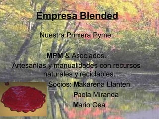 MPM & Asociados es una empresa que fabricará artesanías y manualidades utilizando recursos naturales y reciclables. La empresa requiere una inversión inicial de $300,000 para alquilar un local, comprar materias primas e implementar una campaña publicitaria. Los socios aportarán $100,000 cada uno. La empresa empleará a 2 vendedores, 3 fabricantes y un jefe de plaza para producir una variedad de productos y espera abrir una sucursal en el primer año y expandirse regionalmente en el futuro.