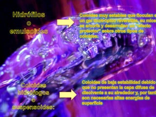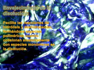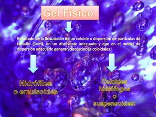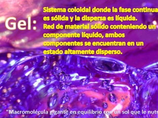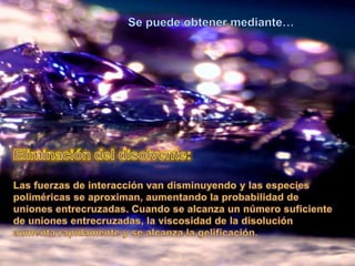 Este documento describe la síntesis de geles óxidos poliméricos. Se obtienen mediante la polimerización de unidades multifuncionales que forman enlaces químicos para asegurar la cohesión del sistema. La transición sol-gel no es reversible una vez formados los enlaces. Los geles se sintetizan a partir de alcóxidos metálicos que forman una dispersión de partículas de unos 100 Å de diámetro compuestas de precursores menores que las micelas en el sol.
