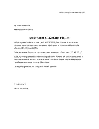 Isaura Quisaguano solicita ayuda al administrador de la unidad para reparar el alumbrado público en la Urbanización el Porton del Rio. Específicamente, pide que se arreglen las luces en los postes con los números F,P,S,A,9.X,3,5,0 17,38,10 y en otro poste con números poco legibles que podrían ser 8X,3,5,0,17,08,10. Ella agradece la ayuda con la petición.