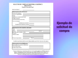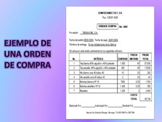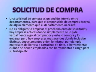 Una solicitud de compra es un pedido interno entre departamentos para que el responsable de compras provea elementos necesarios, mientras que una orden de compra es una solicitud escrita a un proveedor especificando artículos, precios, términos de pago y entrega. Las órdenes de compra enumeran los artículos que una empresa adquirirá y proporcionan control sobre su uso, siendo enviadas al proveedor y a contabilidad para registrar la cuenta por pagar.