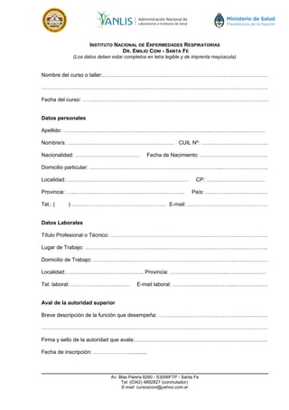 Este documento es un formulario de inscripción para cursos o talleres en el Instituto Nacional de Enfermedades Respiratorias Dr. Emilio Coni en Santa Fe, Argentina. El formulario solicita información personal como nombre, fecha de nacimiento, domicilio, datos laborales y una breve descripción de la función del solicitante, así como la firma y sello de la autoridad que avala la participación en el curso o taller.
